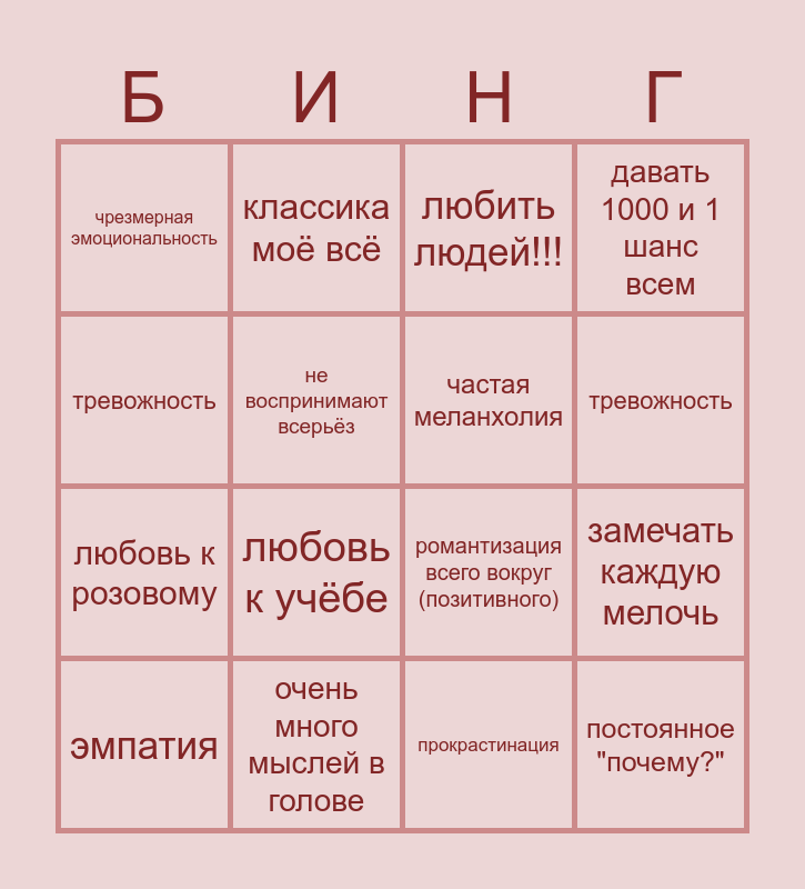 This bingo card has 16 words: очень много мыслей в голове, замечать каждую мелочь, любить людей!!!, чрезмерная эмоциональность, любовь к розовому, классика моё всё, романтизация всего вокруг (позитивного), прокрастинация, тревожность, не воспринимают всерьёз, эмпатия, давать 1000 и 1 шанс всем, любовь к учёбе, тревожность, частая меланхолия and постоянное "почему?".