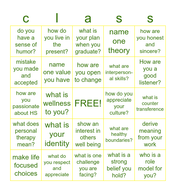This bingo card has a free space and 24 words: what is your identity, what do you respect and appreciate, how are you open to change, make life focused choices, how are you honest and sincere?, do you have a sense of humor?, mistake you made and accepted, how do you live in the present?, how do you appreciate your culture?, show an interest in others well being, what are interperson-al skills?, how are you passionate about HS, what are healthy boundaries?, derive meaning from your work, name one value you have, what is a strong belief you hold?, what is counter transference, what is your plan when you graduate?, How are you a good listener?, what is wellness to you?, who is a role model for you?, what does personal therapy mean?, name one theory and what is one challenge you are facing?.