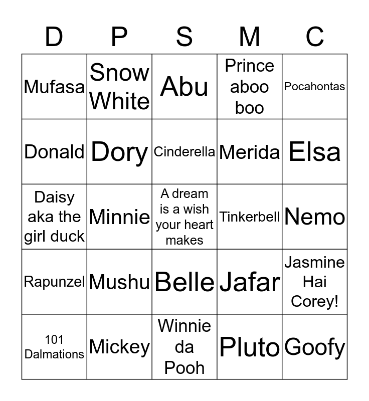 This bingo card has a free space and 24 words: Mushu, Mickey, Cinderella, 101 Dalmations, Pocahontas, Mufasa, Donald, Snow White, Tinkerbell, Belle, Merida, Daisy aka the girl duck, Jafar, Jasmine Hai Corey!, Dory, Pluto, Nemo, Abu, Elsa, Minnie, Goofy, Rapunzel, Prince aboo boo and Winnie da Pooh.