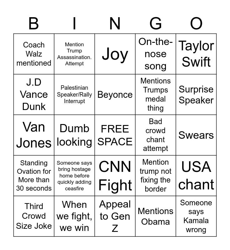 This bingo card has a free space and 24 words: Third Crowd Size Joke, Someone says bring hostage home before quickly adding ceasfire, Beyonce, Mentions Obama, Taylor Swift, Coach Walz mentioned, Mention Trump Assassination. Attempt, Joy, Bad crowd chant attempt, Swears, Van Jones, Palestinian Speaker/Rally Interrupt, Mention trump not fixing the border, USA chant, J.D Vance Dunk, When we fight, we win, Appeal to Gen Z, On-the-nose song, Surprise Speaker, Standing Ovation for More than 30 seconds, Dumb looking, CNN Fight, Mentions Trumps medal thing and Someone says Kamala wrong.