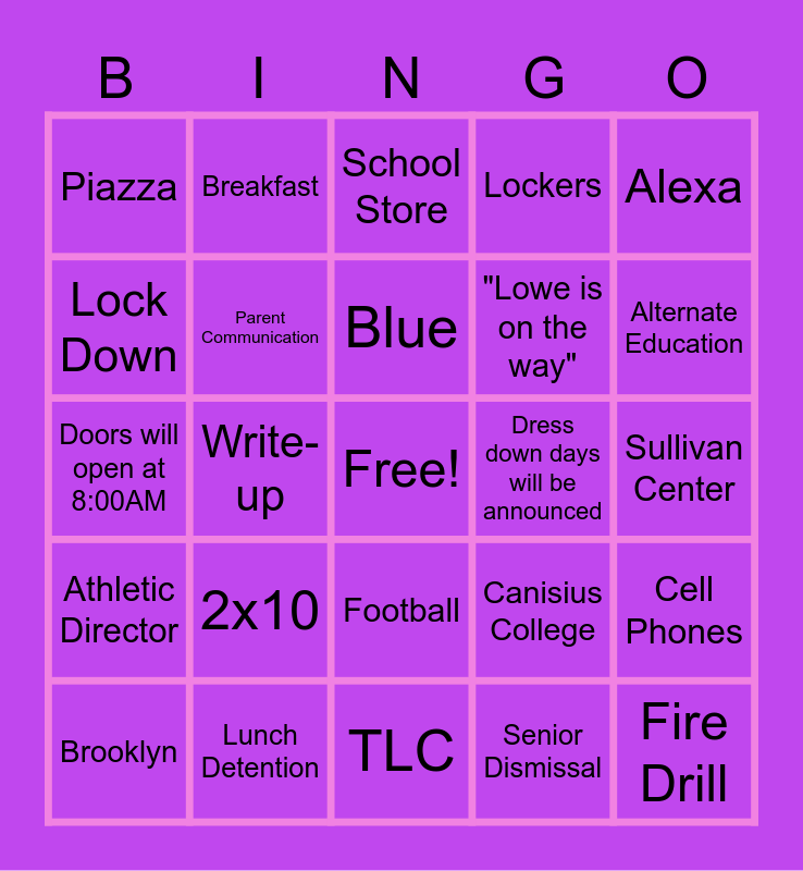This bingo card has a free space and 29 words: Brooklyn, Safety, Write-up, Attendance, Piazza, School Store, Parent Communication, 2x10, Dress down days will be announced, Lunch Detention, Sullivan Center, Fire Drill, TLC, Senior Dismissal, Alternate Education, PSR, Football, Athletic Director, Alexa, Doors will open at 8:00AM, Canisius College, Chromebook, "Lowe is on the way", Lock Down, Lockers, Breakfast, Cell Phones, Blue and Green.