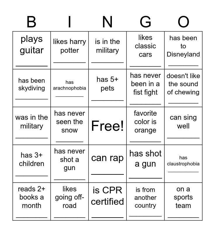 This bingo card has a free space and 24 words: has never shot a gun ________, likes going off-road ________, has 5+ pets ________, reads 2+ books a month ________, has been to Disneyland ________, plays guitar ______, has been skydiving _________, likes harry potter ________, favorite color is orange ________, can rap ______, has never been in a fist fight ________, was in the military ________, has shot a gun _______, has claustrophobia ___________, has arachnophobia __________, is from another country _________, can sing well ________, is in the military ________, doesn't like the sound of chewing ________, has never seen the snow _______, on a sports team ________, has 3+ children ________, likes classic cars ________ and is CPR certified ______.