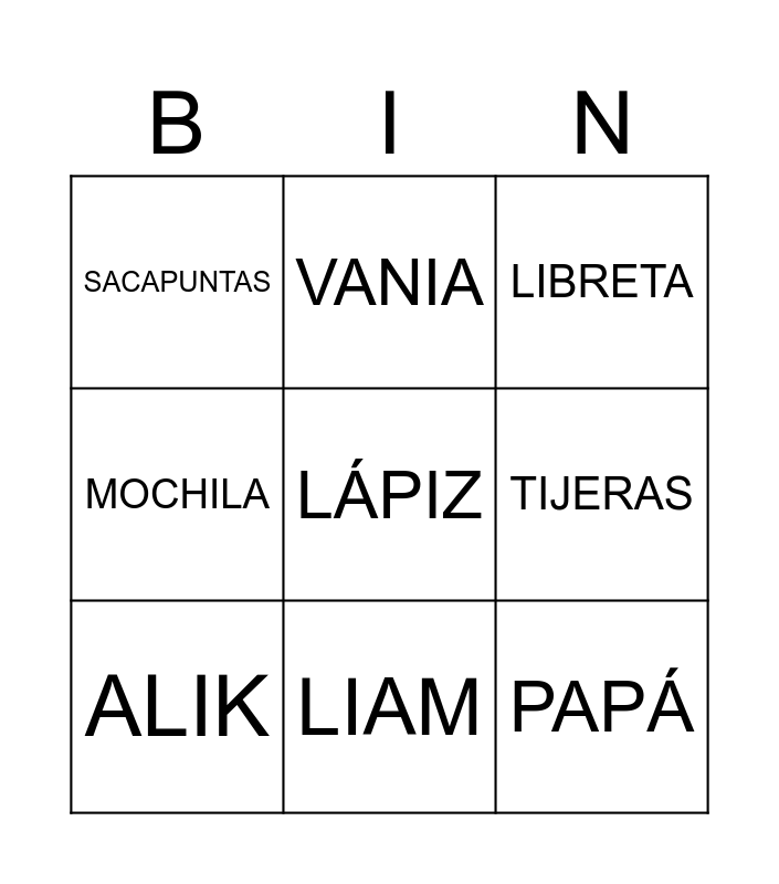 This bingo card has a free space and 11 words: MAMÁ, LIAM, PAPÁ, ALIK, VANIA, LIBRETA, TIJERAS, GOMA, MOCHILA, SACAPUNTAS and PEGAMENTO.