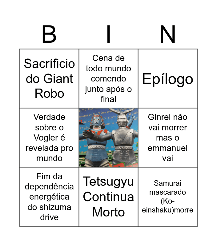 This bingo card has a free space and 8 words: Ginrei não vai morrer mas o emmanuel vai, Epílogo, Cena de todo mundo comendo junto após o final, Fim da dependência energética do shizuma drive, Sacríficio do Giant Robo, Samurai mascarado (Ko-einshaku)morre, Verdade sobre o Vogler é revelada pro mundo and Tetsugyu Continua Morto.