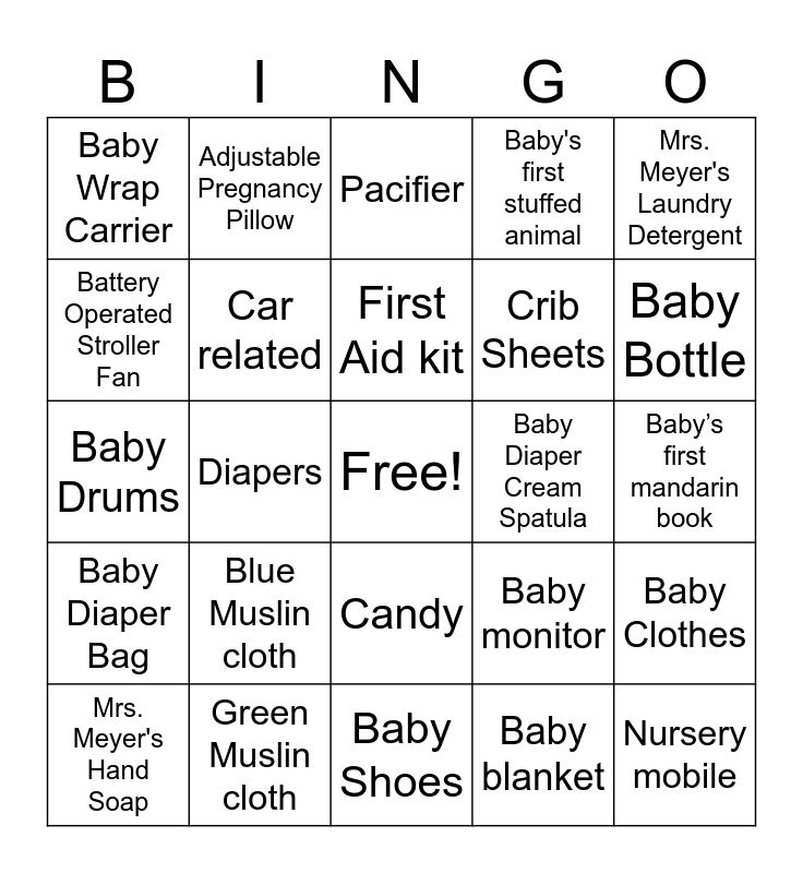 This bingo card has a free space and 24 words: Blue Muslin cloth, Green Muslin cloth, First Aid kit, Mrs. Meyer's Hand Soap, Mrs. Meyer's Laundry Detergent, Baby Wrap Carrier, Battery Operated Stroller Fan, Adjustable Pregnancy Pillow, Baby Diaper Cream Spatula, Candy, Crib Sheets, Baby Drums, Baby monitor, Baby Clothes, Car related, Baby blanket, Baby’s first mandarin book, Pacifier, Baby Bottle, Diapers, Nursery mobile, Baby Diaper Bag, Baby's first stuffed animal and Baby Shoes.