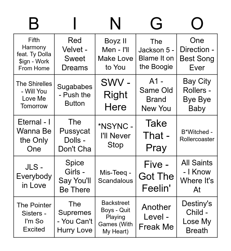 This bingo card has 49 words: Free!, *NSYNC - I'll Never Stop, TLC - No Scrubs, Backstreet Boys - Quit Playing Games (With My Heart), Spice Girls - Say You'll Be There, Hanson - MMMbop, Red Velvet - Sweet Dreams, O-Town - Liquid Dreams, The Shirelles - Will You Love Me Tomorrow, Boyzone - All That I Need, Sugababes - Push the Button, The Jackson 5 - Blame It on the Boogie, All Saints - I Know Where It's At, Five - Got The Feelin', Martha & The Vandellas - Dancing in the Street, Westlife - When You're Looking Like That, SWV - Right Here, Take That - Pray, Atomic Kitten - Right Now, One Direction - Best Song Ever, The Pussycat Dolls - Don't Cha, Another Level - Freak Me, Fifth Harmony feat. Ty Dolla $ign - Work From Home, A1 - Same Old Brand New You, Sister Sledge - We Are Family, Bay City Rollers - Bye Bye Baby, The Pointer Sisters - I'm So Excited, New Kids on the Block - You Got It (The Right Stuff), Mis-Teeq - Scandalous, JLS - Everybody in Love, The Ronettes - Be My Baby, The Wanted - Gold Forever, Girls Aloud - Biology, Busted - What I Go to School For, The Supremes - You Can't Hurry Love, New Edition - Candy Girl, Little Mix - Black Magic, 911 - Bodyshakin', B*Witched - Rollercoaster, East 17 - Deep (Breath Mix), The Saturdays - Not Giving Up, Blue - Too Close, Destiny's Child - Lose My Breath, Lonestar - Amazed, Eternal - I Wanna Be the Only One, Boyz II Men - I'll Make Love to You, Sugababes - Overload, All-4-One - I Swear and En Vogue - Don't Let Go (Love).