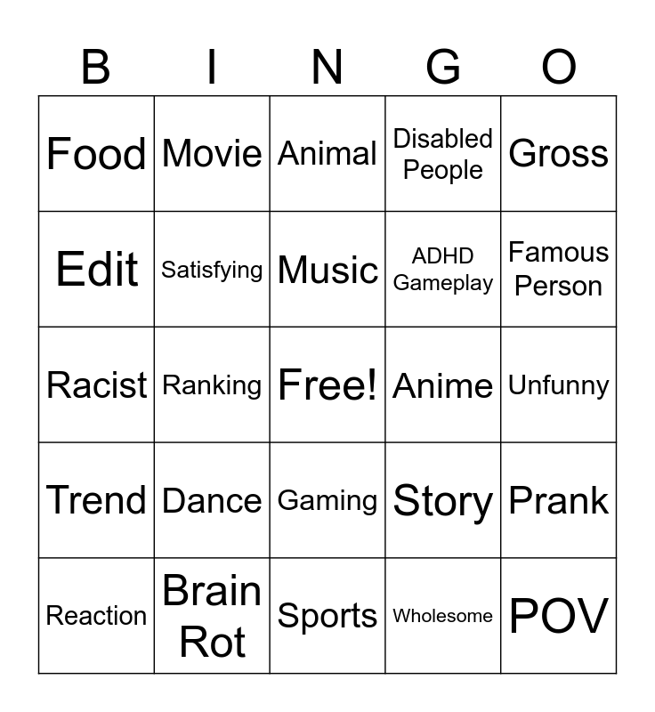 This bingo card has a free space and 24 words: Dance, Brain Rot, Music, Reaction, Gross, Food, Edit, Movie, Anime, Gaming, ADHD Gameplay, Racist, Story, Prank, Satisfying, Wholesome, Unfunny, Animal, Famous Person, Ranking, POV, Trend, Disabled People and Sports.