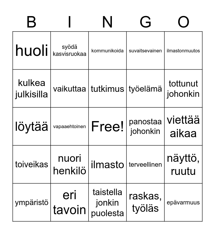 This bingo card has a free space and 24 words: nuori henkilö, eri tavoin, tutkimus, ympäristö, ilmastonmuutos, huoli, kulkea julkisilla, syödä kasvisruokaa, panostaa johonkin, ilmasto, työelämä, löytää, terveellinen, näyttö, ruutu, vaikuttaa, raskas, työläs, viettää aikaa, kommunikoida, tottunut johonkin, vapaaehtoinen, epävarmuus, toiveikas, suvaitsevainen and taistella jonkin puolesta.
