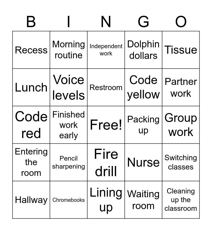 This bingo card has a free space and 25 words: Pencil sharpening, Lining up, Restroom, Hallway, Tissue, Recess, Lunch, Morning routine, Packing up, Fire drill, Code yellow, Code red, Nurse, Switching classes, Voice levels, Transitions, Group work, Independent work, Partner work, Finished work early, Cleaning up the classroom, Chromebooks, Entering the room, Dolphin dollars and Waiting room.