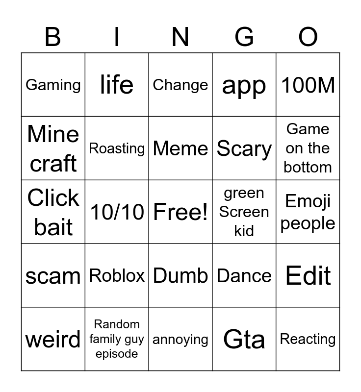 This bingo card has a free space and 24 words: Roblox, Random family guy episode, Meme, weird, 100M, Gaming, Mine craft, life, green Screen kid, Dumb, Scary, Click bait, Dance, Edit, Roasting, Gta, Emoji people, Change, Game on the bottom, 10/10, Reacting, scam, app and annoying.