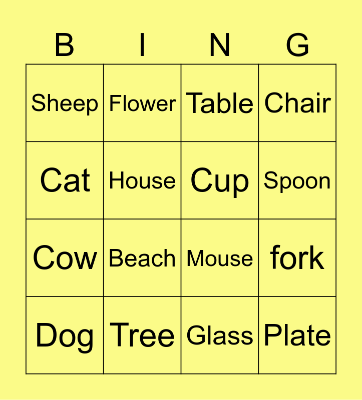This bingo card has 16 words: Dog, Tree, Table, Chair, Cat, Flower, Mouse, fork, Sheep, House, Glass, Spoon, Cow, Beach, Cup and Plate.