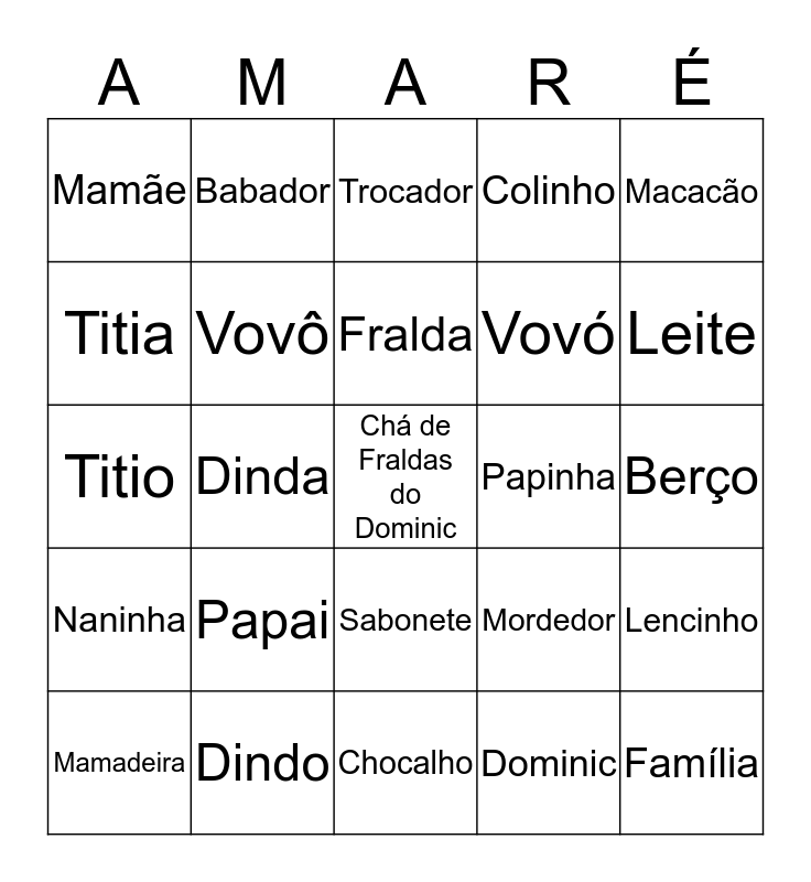 This bingo card has a free space and 24 words: Papai, Dindo, Fralda, Mamadeira, Macacão, Mamãe, Titia, Babador, Papinha, Sabonete, Vovó, Titio, Mordedor, Lencinho, Vovô, Dominic, Berço, Trocador, Leite, Dinda, Família, Naninha, Colinho and Chocalho.