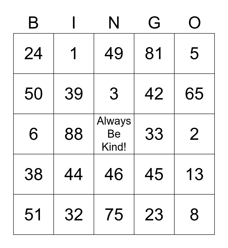 This bingo card has a free space and 24 words: 44, 32, 3, 51, 5, 24, 50, 1, 33, 46, 42, 6, 45, 13, 39, 23, 2, 49, 65, 88, 8, 38, 81 and 75.