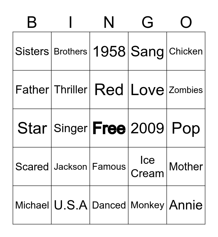 This bingo card has a free space and 24 words: Michael, Jackson, Red, Monkey, Chicken, Sisters, Brothers, 1958, 2009, Pop, Star, Thriller, Ice Cream, Mother, Father, U.S.A, Danced, Sang, Zombies, Scared, Singer, Famous, Love and Annie.