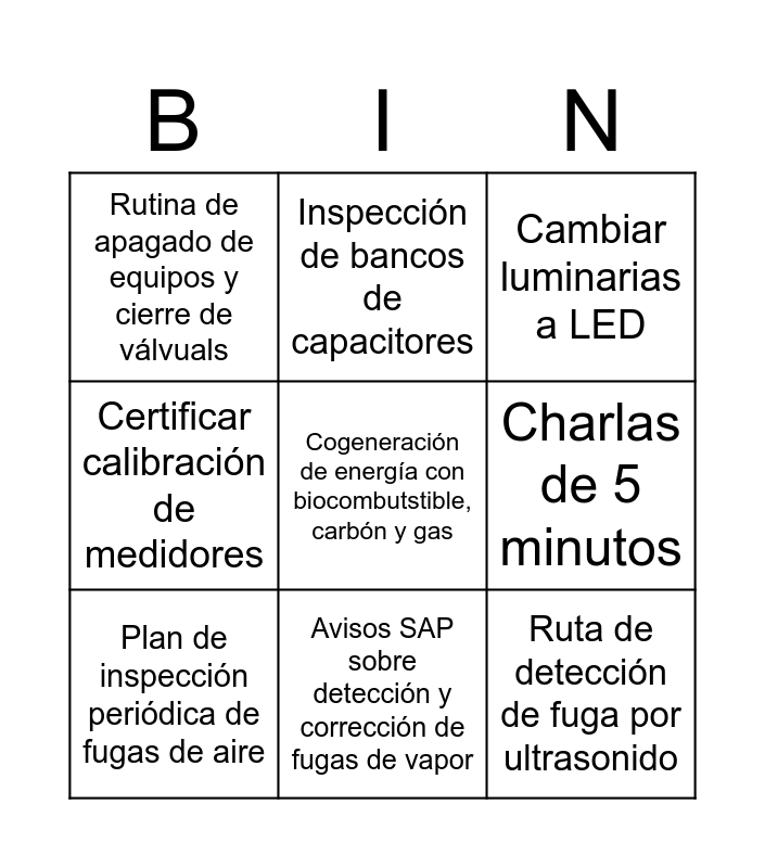 This bingo card has 17 words: Seguimiento a indicadores de energía, Actualizar diagramas eléctricos de proceso, Cambiar luminarias a LED, Rutina de apagado de equipos y cierre de válvuals, Recubrimiento tuberías de vapor, Certificar calibración de medidores, Recuperación de condensados - sistemas de vapor, Plan de inspección periódica de fugas de aire, Avisos SAP sobre detección y corrección de fugas de vapor, Charlas de 5 minutos, Inducción a contratistas, Conciencitación a personal de batidores sobre arreglos en refinamiento, Cogeneración de energía con biocombutstible, carbón y gas, Inspección de bancos de capacitores, Ruta de detección de fuga por ultrasonido, Letreros sobre apagar equipos and Limpieza de motores.