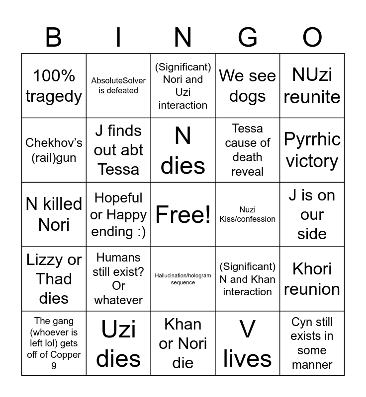 This bingo card has a free space and 24 words: Humans still exist? Or whatever, Uzi dies, N dies, The gang (whoever is left lol) gets off of Copper 9, NUzi reunite, 100% tragedy, Chekhov’s (rail)gun, AbsoluteSolver is defeated, Nuzi Kiss/confession, Hallucination/hologram sequence, Tessa cause of death reveal, N killed Nori, (Significant) N and Khan interaction, Khori reunion, J finds out abt Tessa, V lives, J is on our side, (Significant) Nori and Uzi interaction, Pyrrhic victory, Hopeful or Happy ending :), Cyn still exists in some manner, Lizzy or Thad dies, We see dogs and Khan or Nori die.