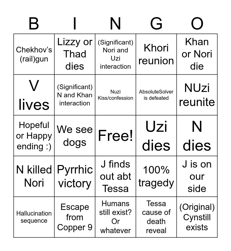 This bingo card has a free space and 24 words: Pyrrhic victory, Escape from Copper 9, Nuzi Kiss/confession, Hallucination sequence, Khan or Nori die, Chekhov’s (rail)gun, V lives, Lizzy or Thad dies, Uzi dies, J finds out abt Tessa, AbsoluteSolver is defeated, Hopeful or Happy ending :), 100% tragedy, J is on our side, (Significant) N and Khan interaction, Tessa cause of death reveal, N dies, (Significant) Nori and Uzi interaction, NUzi reunite, We see dogs, (Original) Cynstill exists, N killed Nori, Khori reunion and Humans still exist? Or whatever.