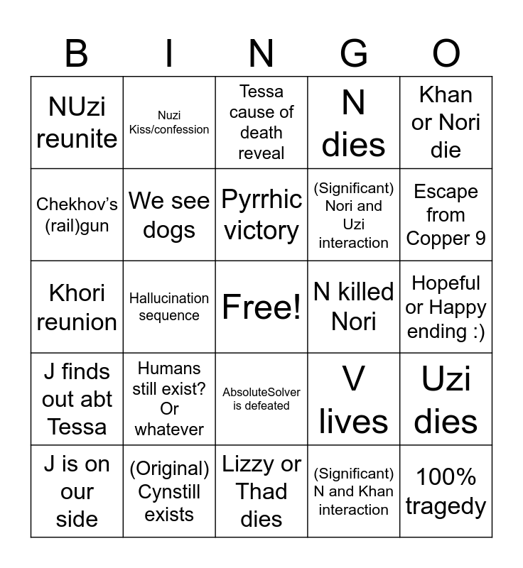 This bingo card has a free space and 24 words: Humans still exist? Or whatever, (Original) Cynstill exists, Pyrrhic victory, J is on our side, Khan or Nori die, NUzi reunite, Chekhov’s (rail)gun, Nuzi Kiss/confession, N killed Nori, AbsoluteSolver is defeated, (Significant) Nori and Uzi interaction, Khori reunion, V lives, Uzi dies, We see dogs, (Significant) N and Khan interaction, Hopeful or Happy ending :), Tessa cause of death reveal, Escape from Copper 9, Hallucination sequence, 100% tragedy, J finds out abt Tessa, N dies and Lizzy or Thad dies.