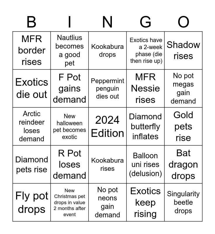 This bingo card has a free space and 24 words: R Pot loses demand, New Christmas pet drops in value 2 months after event, Peppermint penguin dies out, Fly pot drops, Shadow rises, MFR border rises, Exotics die out, Nautlius becomes a good pet, Diamond butterfly inflates, Kookabura rises, MFR Nessie rises, Arctic reindeer loses demand, Balloon uni rises (delusion), Bat dragon drops, F Pot gains demand, Exotics keep rising, Gold pets rise, Kookabura drops, No pot megas gain demand, New halloween pet becomes exotic, Singularity beetle drops, Diamond pets rise, Exotics have a 2-week phase (die then rise up) and No pot neons gain demand.
