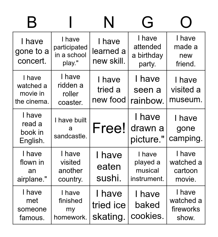 This bingo card has a free space and 24 words: I have visited another country., I have finished my homework., I have tried a new food, I have met someone famous., I have made a new friend., I have gone to a concert., I have watched a movie in the cinema., I have participated in a school play.", I have drawn a picture.", I have eaten sushi., I have seen a rainbow., I have read a book in English., I have played a musical instrument., I have watched a cartoon movie., I have ridden a roller coaster., I have baked cookies., I have gone camping., I have learned a new skill., I have visited a museum., I have built a sandcastle., I have watched a fireworks show., I have flown in an airplane.", I have attended a birthday party. and I have tried ice skating..