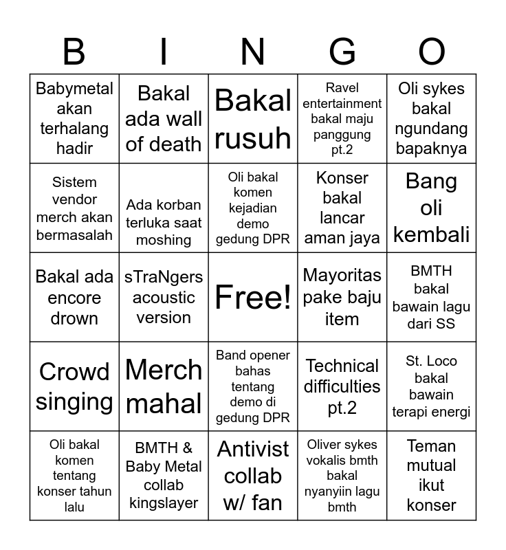 This bingo card has a free space and 24 words: Oli bakal komen tentang konser tahun lalu, Merch mahal, Oli bakal komen kejadian demo gedung DPR, Oliver sykes vokalis bmth bakal nyanyiin lagu bmth, Oli sykes bakal ngundang bapaknya, Babymetal akan terhalang hadir, Bakal ada wall of death, Bakal rusuh, Mayoritas pake baju item, BMTH bakal bawain lagu dari SS, Bakal ada encore drown, Ada korban terluka saat moshing, Technical difficulties pt.2, St. Loco bakal bawain terapi energi, Sistem vendor merch akan bermasalah, BMTH & Baby Metal collab kingslayer, Antivist collab w/ fan, Ravel entertainment bakal maju panggung pt.2, Bang oli kembali, Crowd singing, sTraNgers acoustic version, Band opener bahas tentang demo di gedung DPR, Konser bakal lancar aman jaya and Teman mutual ikut konser.