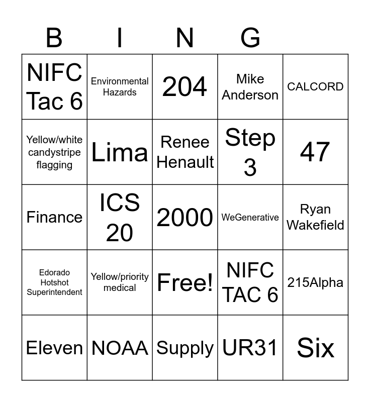 This bingo card has 26 words: Free!, UR31, Renee Henault, NOAA, CALCORD, NIFC Tac 6, Yellow/white candystripe flagging, Environmental Hazards, Ryan Wakefield, NIFC TAC 6, Step 3, Finance, 215Alpha, Eleven, ICS 20, Ivan Magana, Mike Anderson, Edorado Hotshot Superintendent, 204, 2000, 47, Supply, WeGenerative, Yellow/priority medical, Lima and Six.