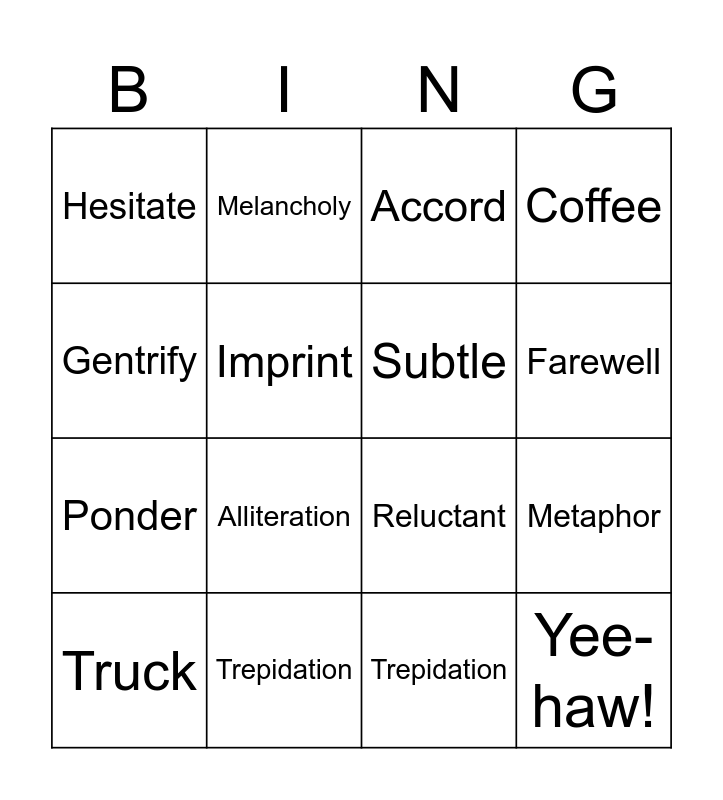 This bingo card has 25 words: Connotation, Endure, Farewell, Fleeting, Gentrify, Hesitate, Imprint, Melancholy, Trepidation, Nostalgia, Ponder, Reluctant, Reminisce, Sentimental, Subtle, Transition, Trepidation, Accord, Alliteration, Metaphor, Truck, Xylophone, Yee-haw!, Coffee and Inference.