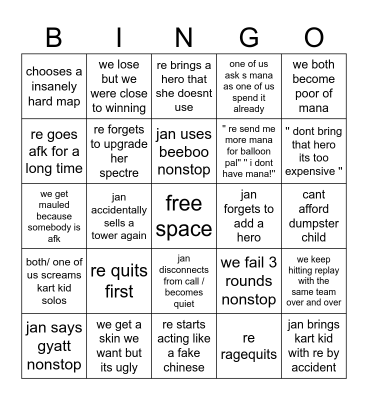 This bingo card has a free space and 29 words: jan says gyatt nonstop, none of us brings lemonade cat, jan accidentally sells a tower again, we find a mimic but its a coin mimic / we scream, chooses a insanely hard map, re brings a hero that she doesnt use, re forgets to upgrade her spectre, re quits first, jan forgets to add a hero, we get a skin we want but its ugly, cant afford dumpster child, jan brings kart kid with re by accident, re starts acting like a fake chinese, re ragequits, '' dont bring that hero its too expensive '', either one of us begs for mana a big amount, jan disconnects from call / becomes quiet, both/ one of us screams kart kid solos, we both become poor of mana, we get mauled because somebody is afk, we fail 3 rounds nonstop, beeboo hatred, '' re send me more mana for balloon pal'' '' i dont have mana!'', re goes afk for a long time, one of us ask s mana as one of us spend it already, we lose but we were close to winning, we keep hitting replay with the same team over and over, jan uses beeboo nonstop and jan convinced re that team is good , plan need to be changed (false).