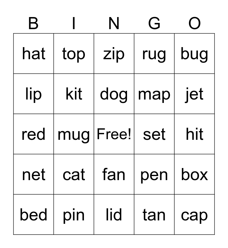 This bingo card has a free space and 24 words: cat, pin, dog, bed, bug, hat, lip, top, set, fan, map, red, pen, box, kit, tan, hit, zip, jet, mug, cap, net, rug and lid.