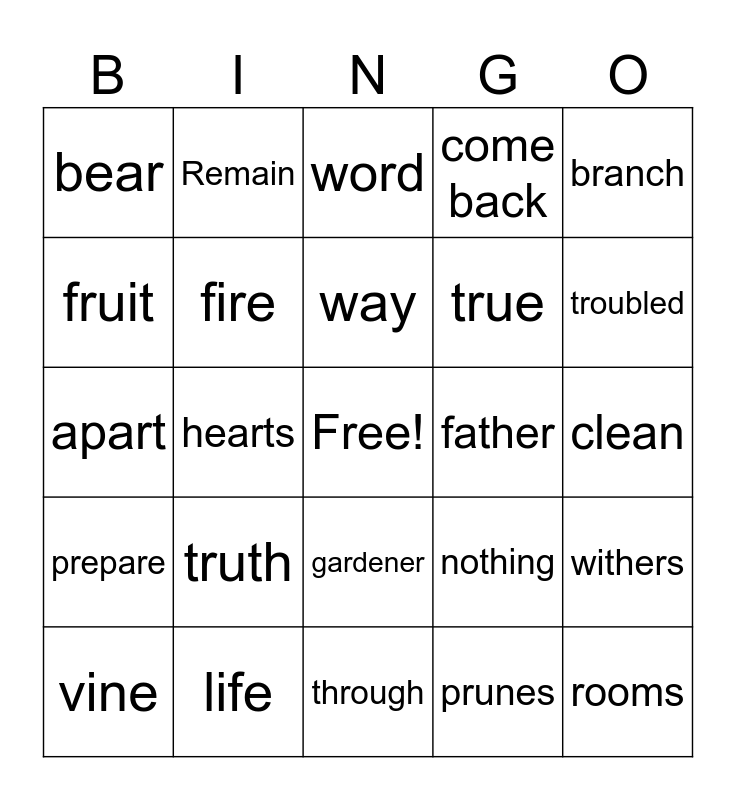 This bingo card has a free space and 24 words: truth, life, way, vine, branch, bear, fruit, Remain, father, gardener, true, apart, nothing, withers, fire, prunes, clean, word, troubled, hearts, rooms, prepare, come back and through.