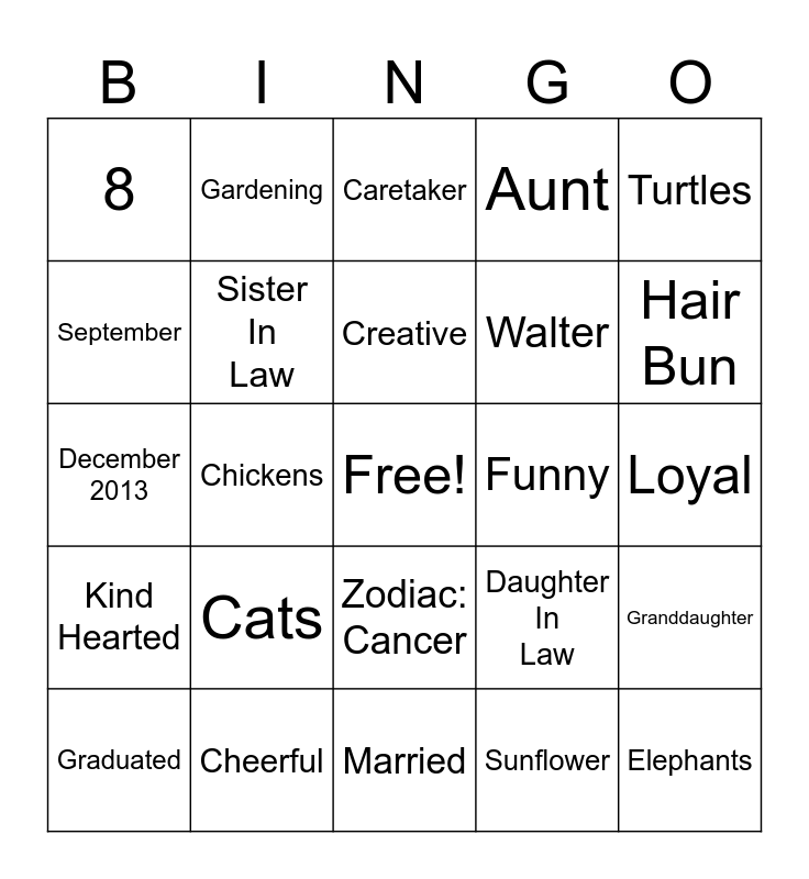 This bingo card has a free space and 49 words: 1986, Elephants, Crafts, Married, Cats, July, Gardening, Singing, September, Dogs, Sister In Law, Aunt, Granddaughter, Daughter In Law, Dependable, Compassionate, Creative, Funny, Artistic, Turtles, Chickens, Sunflower, 8, Walter, Ella, Hair Bun, Graduated, Dawn, Zodiac: Cancer, Kind Hearted, Friend, Baby Blue, Sister, Daughter, Cheerful, Kind, Generous, Helpful, Loyal, Wife, Pumpkin Spice, December 7th, 2007, Sweet Tea, December 2013, Caretaker, Hummingbirds, Canning and Crochet.