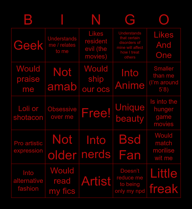 This bingo card has a free space and 24 words: Not older, Would read my fics, Would ship our ocs, Into alternative fashion, Likes And One, Geek, Would praise me, Understands me / relates to me, Unique beauty, Into nerds, Into Anime, Loli or shotacon, Bsd Fan, Would match morilise wit me, Not amab, Doesn’t reduce me to being only my npd, Is into the hunger game movies, Likes resident evil (the movies), Smaller than me (I’m around 5’8), Obsessive over me, Little freak, Pro artistic expression, Understands that certain disorders of mine will affect how I treat others and Artist.