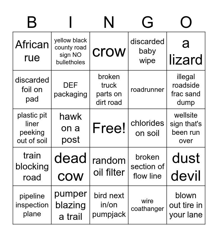 This bingo card has a free space and 24 words: dead cow, pumper blazing a trail, broken truck parts on dirt road, pipeline inspection plane, a lizard, African rue, discarded foil on pad, yellow black county road sign NO bulletholes, chlorides on soil, random oil filter, roadrunner, plastic pit liner peeking out of soil, broken section of flow line, dust devil, DEF packaging, wire coathanger, wellsite sign that's been run over, crow, illegal roadside frac sand dump, hawk on a post, blown out tire in your lane, train blocking road, discarded baby wipe and bird next in/on pumpjack.