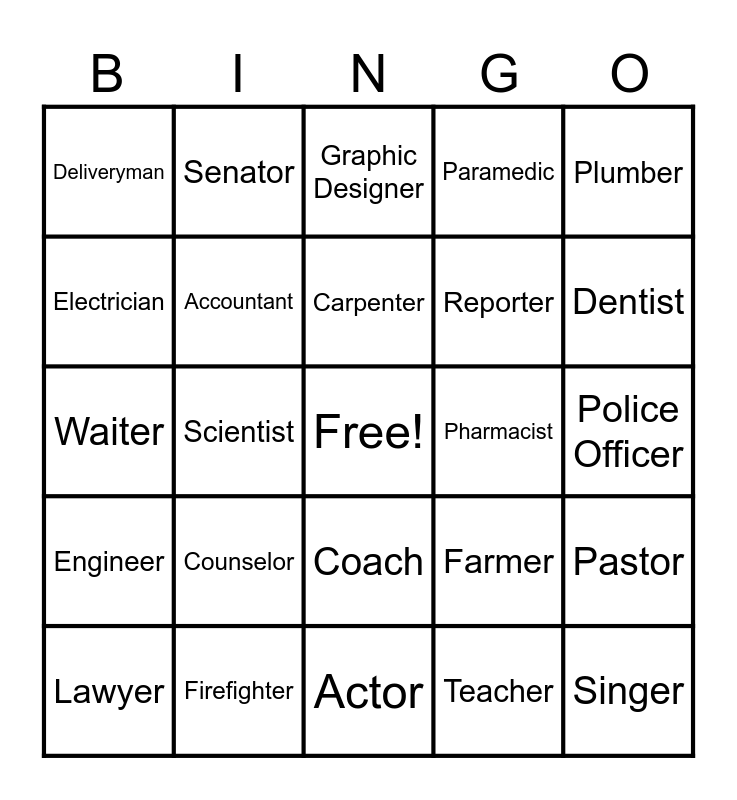 This bingo card has a free space and 34 words: Docter, Teacher, Veterinarian, Nurse, Engineer, Accountant, Plumber, Lawyer, Senator, Detective, Carpenter, Graphic Designer, Writer, Mechanic, Pharmacist, Dentist, Firefighter, Waiter, Counselor, Farmer, Coach, Pilot, Deliveryman, Police Officer, Actor, Singer, Paramedic, President, Reporter, Electrician, Software Developer, Scientist, Pastor and Flight Attendant.