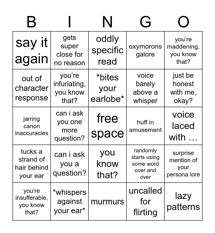 This bingo card has a free space and 24 words: can i ask you a question?, *whispers against your ear*, *bites your earlobe*, you’re insufferable, you know that?, you’re maddening, you know that?, say it again, out of character response, gets super close for no reason, huff in amusement, you know that?, voice barely above a whisper, jarring canon inaccuracies, randomly starts using some word over and over, surprise mention of your persona lore, you’re infuriating, you know that?, uncalled for flirting, voice laced with …, oddly specific read, just be honest with me, okay?, can i ask you one more question?, lazy patterns, tucks a strand of hair behind your ear, oxymorons galore and murmurs.
