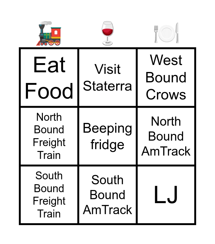 This bingo card has 9 words: South Bound Freight Train, West Bound Crows, Visit Staterra, North Bound Freight Train, Eat Food, North Bound AmTrack, Beeping fridge, LJ and South Bound AmTrack.