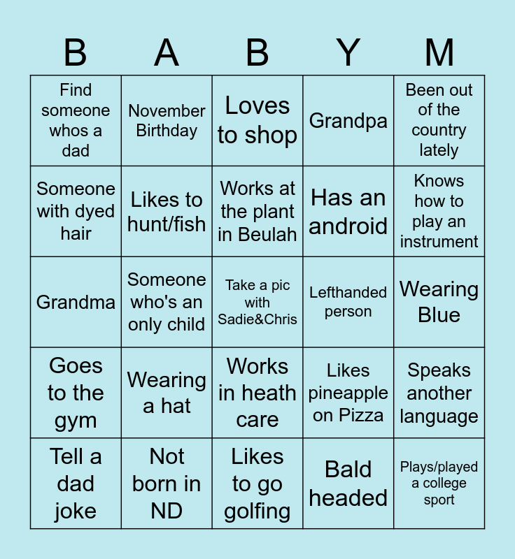 This bingo card has a free space and 24 words: Wearing a hat, Not born in ND, Works at the plant in Beulah, Tell a dad joke, Been out of the country lately, Find someone whos a dad, Someone with dyed hair, November Birthday, Lefthanded person, Works in heath care, Has an android, Grandma, Likes pineapple on Pizza, Speaks another language, Likes to hunt/fish, Bald headed, Wearing Blue, Loves to shop, Knows how to play an instrument, Someone who's an only child, Plays/played a college sport, Goes to the gym, Grandpa and Likes to go golfing.