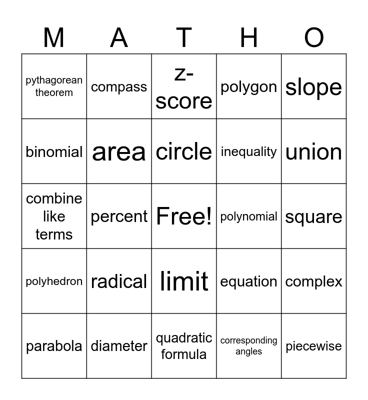 This bingo card has a free space and 24 words: radical, diameter, circle, parabola, slope, pythagorean theorem, binomial, compass, polynomial, limit, inequality, combine like terms, equation, complex, area, corresponding angles, square, z-score, union, percent, piecewise, polyhedron, polygon and quadratic formula.