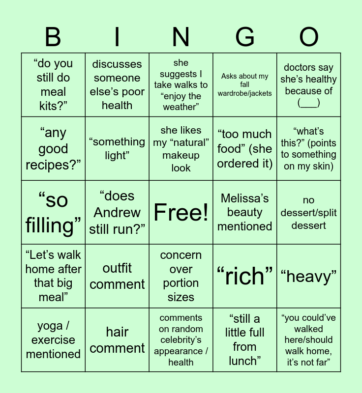 This bingo card has a free space and 24 words: outfit comment, hair comment, she likes my “natural” makeup look, yoga / exercise mentioned, doctors say she’s healthy because of (___), “do you still do meal kits?”, “any good recipes?”, discusses someone else’s poor health, Melissa’s beauty mentioned, concern over portion sizes, “too much food” (she ordered it), “so filling”, “rich”, “heavy”, “something light”, “still a little full from lunch”, no dessert/split dessert, she suggests I take walks to “enjoy the weather”, “what’s this?” (points to something on my skin), “does Andrew still run?”, “you could’ve walked here/should walk home, it’s not far”, “Let’s walk home after that big meal”, Asks about my fall wardrobe/jackets and comments on random celebrity’s appearance / health.