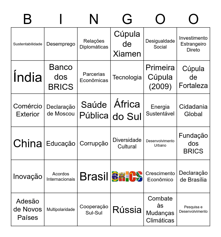 This bingo card has 1 images and 35 words: Brasil, Rússia, Índia, China, África do Sul, Banco dos BRICS, Cooperação Sul-Sul, Desigualdade Social, Crescimento Econômico, Cúpula de Fortaleza, Cúpula de Xiamen, Declaração de Brasília, Declaração de Moscou, Tecnologia, Sustentabilidade, Inovação, Energia Sustentável, Comércio Exterior, Relações Diplomáticas, Saúde Pública, Educação, Diversidade Cultural, Corrupção, Desenvolvimento Urbano, Desemprego, Primeira Cúpula (2009), Multipolaridade, Parcerias Econômicas, Investimento Estrangeiro Direto, Pesquisa e Desenvolvimento, Adesão de Novos Países, Fundação dos BRICS, Cidadania Global, Acordos Internacionais and Combate às Mudanças Climáticas.