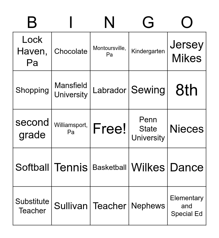 This bingo card has a free space and 31 words: Teacher, Jersey Shore, Pa, Williamsport, Pa, Muncy, Pa, Lock Haven, Pa, Montoursville, Pa, Mansfield University, Wilkes, Penn State University, Nephews, Nieces, Elementary and Special Ed, 6th, 7th, 8th, 9th, Dance, Tennis, Softball, Basketball, Jersey Mikes, Taco Bell, Substitute Teacher, Chocolate, Sewing, Shopping, Kindergarten, second grade, Sullivan, Labrador and Collie.