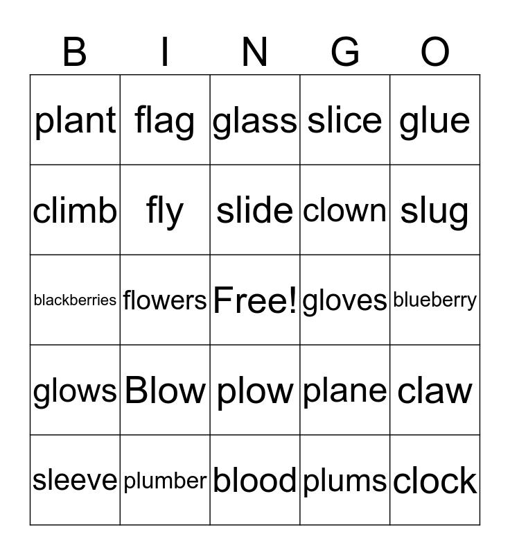 This bingo card has a free space and 24 words: Blow, plumber, slide, sleeve, glue, plant, climb, flag, gloves, plow, clown, blackberries, plane, claw, fly, plums, blueberry, glass, slug, flowers, clock, glows, slice and blood.
