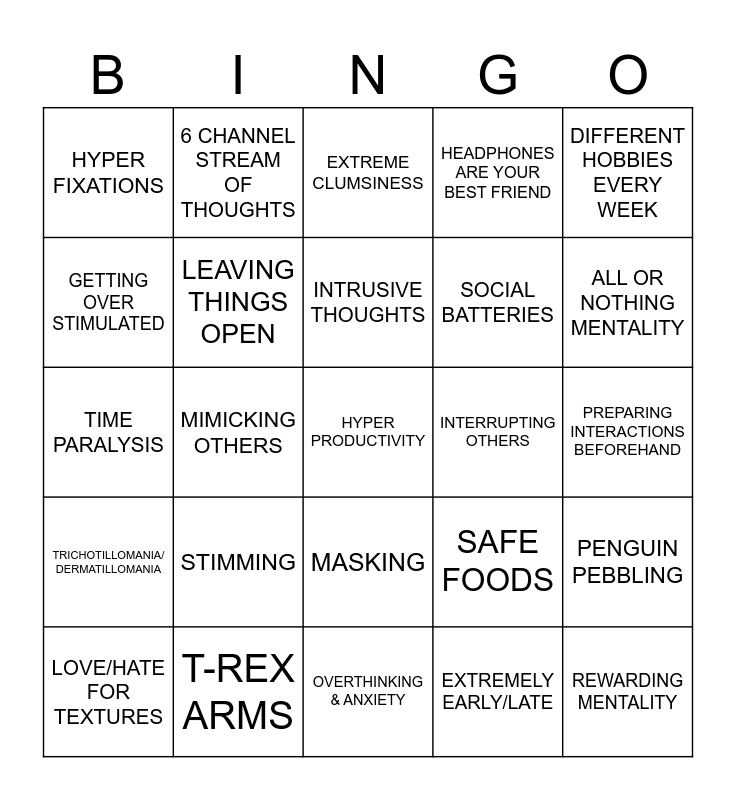 This bingo card has a free space and 24 words: STIMMING, T-REX ARMS, INTRUSIVE THOUGHTS, LOVE/HATE FOR TEXTURES, DIFFERENT HOBBIES EVERY WEEK, HYPER FIXATIONS, GETTING OVER STIMULATED, 6 CHANNEL STREAM OF THOUGHTS, INTERRUPTING OTHERS, MASKING, SOCIAL BATTERIES, TIME PARALYSIS, SAFE FOODS, PENGUIN PEBBLING, LEAVING THINGS OPEN, EXTREMELY EARLY/LATE, PREPARING INTERACTIONS BEFOREHAND, EXTREME CLUMSINESS, ALL OR NOTHING MENTALITY, MIMICKING OTHERS, REWARDING MENTALITY, TRICHOTILLOMANIA/ DERMATILLOMANIA, HEADPHONES ARE YOUR BEST FRIEND and OVERTHINKING & ANXIETY.