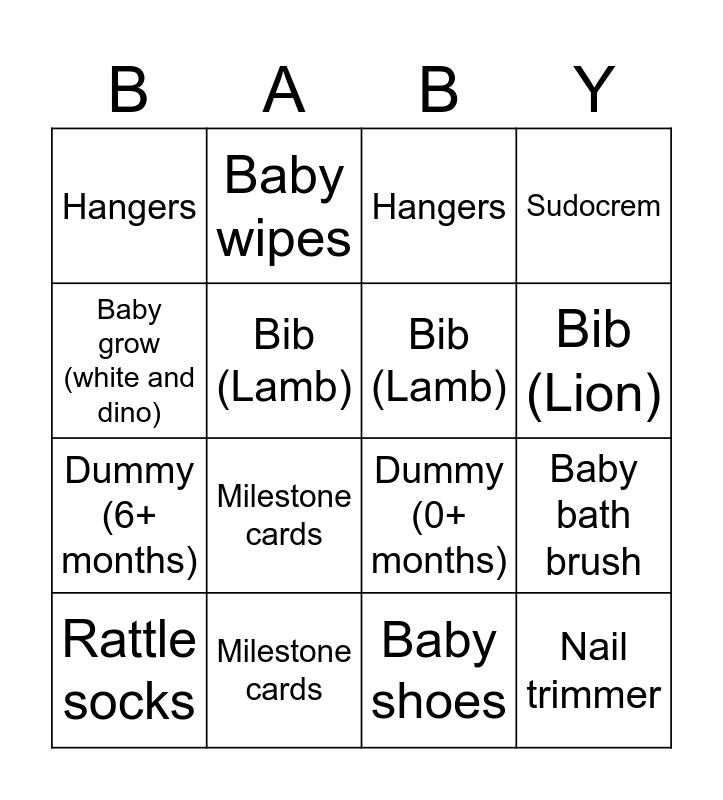⚠ This card has duplicate items: Story Book (2), Bib (Lamb) (2), Bib (Giraffe) (2), Bib (Snail) (2), Bib (Lion) (2), Nail trimmer (2), Baby bath brush (2), Sudocrem (2), Rattle socks (2), Baby shoes (2), Milestone cards (2), Bibado Coverall (2), Baby Powder (2), Hangers (3)