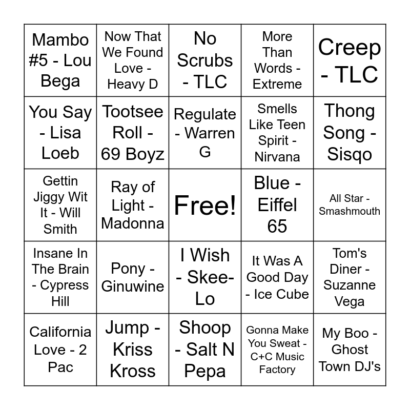 This bingo card has a free space and 92 words: You Can’t Touch This - MC Hammer, Whatta Man - Salt n’ Pepa, Shoop - Salt N Pepa, Good Vibrations - Marky Mark, Baby Got Back - Sir Mix A Lot, Ice Ice Baby - Vanilla Ice, The Choice Is Yours - Black Sheep, California Love - 2 Pac, Honey - Mariah Carey, Poison - Bell Biv DeVoe, Are You Going To Go My Way - Lenny Kravitz, Loser - Beck, What’s Up - 4 Non Blondes, Smells Like Teen Spirit - Nirvana, Real Love - Mary J Blige, Creep - TLC, No Scrubs - TLC, Motownphilly - Boyz II Men, Tubthumping - Chumbawumba, Enter Sandman - Metallica, Say My Name - Destinys Child, Semi-Charmed Life - Third Eye Blind, Still Not a Player (feat Joe) - Big Pun, Even Flow - Pearl Jam, Pony - Ginuwine, Tootsee Roll - 69 Boyz, Return Of The Mack - Mark Morrison, Dreamlover - Mariah Carey, This Is How We Do it - Montell Jordan, No Diggity - Blackstreet, Jump -Kriss Kross, I Wish - Skee-Lo, Hypnotize - The Notorious B.I.G., Basket Case - Green Day, Now That We Found Love - Heavy D, Jump Around - House of Pain, Around The Way Girl - LL Cool J, My Name Is - Eminem, Regulate - Warren G, It Was A Good Day - Ice Cube, Gettin Jiggy Wit It - Will Smith, Insane In The Brain - Cypress Hill, All Star - Smashmouth, I Got 5 On It - Luniz, My Boo - Ghost Town DJ's, Party Up - DMX, Got Your Money - ODB, Treat 'Em Right - Chubb Rock, Mama Said Knock You Out - LL Cool J, Big Poppa - The Notorious BIG, Cmon N Ride It (The Train) - Quad City DJs, Baby One More Time - Britney Spears, Feel so Good - Mase, The Sign - Ace Of Base, Mary Janes's Last Dance - Tom Petty & The Heartbreakers, Genie In A Bottle - Christina Aguilera, All I Wanna Do - Sheryl Crow, You Say - Lisa Loeb, Everybody (Backstreet’s Back) - Backstreets Back, Ray of Light - Madonna, Wannabe - Spice Girls, Rosa Parks - Outkast, Smooth - Santana ft Rob Thomas, Here Come the Hotsteppers - Ini Kamoze, Vogue - Madonna, Gonna Make You Sweat - C+C Music Factory, OPP - Naughty By Nature, To Be With You - Mr Big, Informer - Snow, Nookie - Limp Bizkit, My Own Worst Enemy - Lit, Bawitdaba - Kid Rock, More Than Words - Extreme, Back That Thang Up - Juvenile, Rump Shaker - Wreckx - n- Effect, I Saw The Sign - Ace of Base, Tom's Diner - Suzanne Vega, Tearin' Up My Heart - NSYNC, Everybody - Backstreet Boys, Come Baby Come - K7, Bittersweet Symphony - The Verve, Blue - Eiffel 65, Mambo #5 - Lou Bega, Da' Dip - Freak Nasty, Still D.R.E. - Dr Dre, I Want It That Way - Backstreet Boys, Ruff Ryders' Anthem - DMX, I Get Around - 2Pac, Make 'Em Say Ugh - Master P, Show Me Love - Robin S, Thong Song - Sisqo and Big Poppa - Notorious B.I.G..