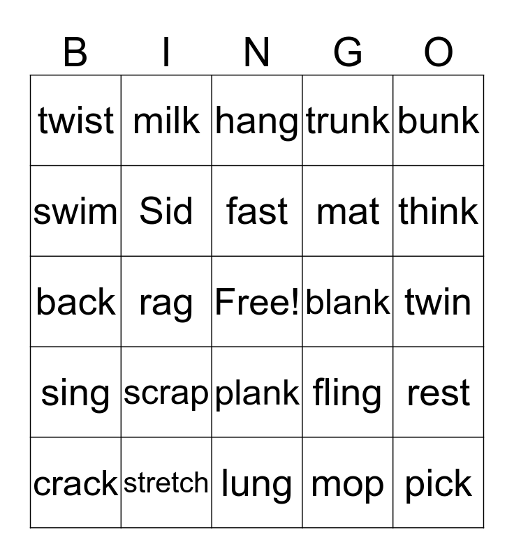 This bingo card has a free space and 24 words: scrap, stretch, fast, crack, bunk, twist, swim, milk, blank, plank, mat, back, fling, rest, Sid, mop, twin, hang, think, rag, pick, sing, trunk and lung.