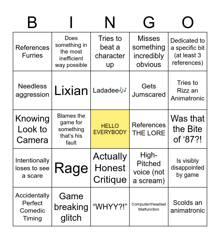 This bingo card has a free space and 29 words: Accidentally Perfect Comedic Timing, Doesn’t listen to the instructions, Blames the game for something that’s his fault, Evil Monologue, References Furries, Tries to beat a character up, Lixian, Rage, References THE LORE, Game breaking glitch, Was that the Bite of ‘87?!, Scolds an animatronic, “WHYY?!”, Computer/Headset Malfunction, Tries to Rizz an Animatronic, Develops a Grudge against a random character, Actually Honest Critique, Intentionally loses to see a scare, Dedicated to a specific bit (at least 3 references), Knowing Look to Camera, High-Pitched voice (not a scream), Genuine scream of terror, Gets Jumscared, Needless aggression, Misses something incredibly obvious, Does something in the most inefficient way possible, Is visibly disappointed by game, Ladadee🎶 and “Is it still recording?”.