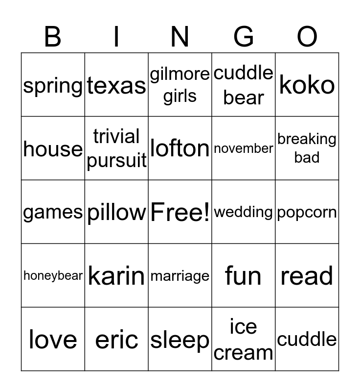 This bingo card has a free space and 24 words: karin, eric, lofton, love, koko, spring, house, texas, wedding, marriage, november, games, fun, read, trivial pursuit, ice cream, popcorn, gilmore girls, breaking bad, pillow, cuddle, honeybear, cuddle bear and sleep.