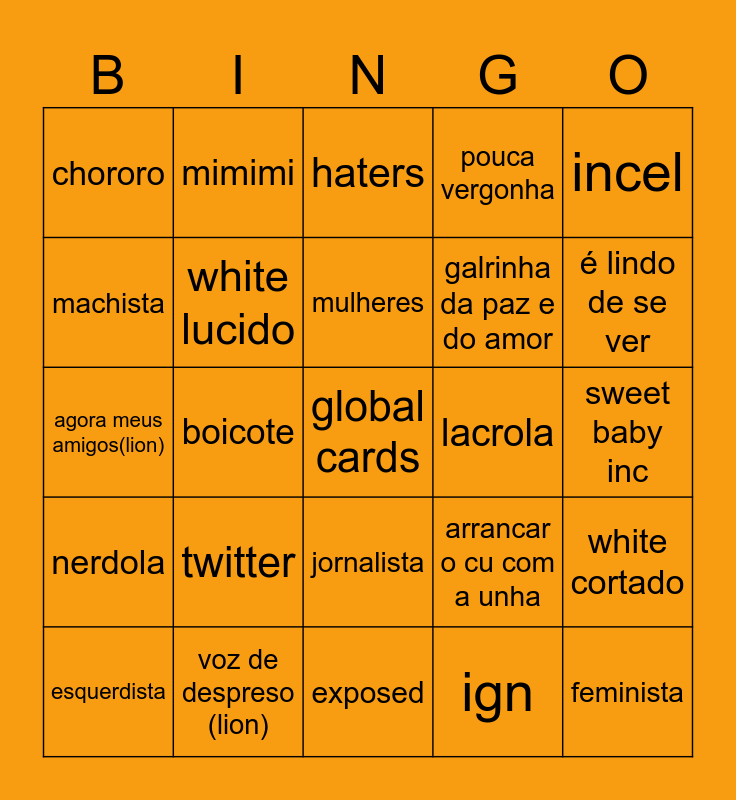 This bingo card has a free space and 24 words: esquerdista, twitter, mulheres, ign, incel, chororo, mimimi, haters, lacrola, sweet baby inc, agora meus amigos(lion), white lucido, arrancar o cu com a unha, white cortado, machista, voz de despreso (lion), exposed, pouca vergonha, é lindo de se ver, nerdola, boicote, jornalista, galrinha da paz e do amor and feminista.