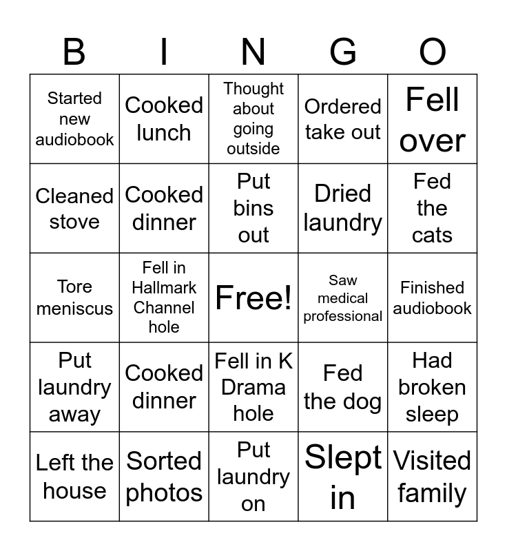 This bingo card has a free space and 24 words: Cooked dinner, Sorted photos, Put bins out, Left the house, Fell over, Started new audiobook, Cleaned stove, Cooked lunch, Saw medical professional, Fell in K Drama hole, Dried laundry, Tore meniscus, Fed the dog, Had broken sleep, Cooked dinner, Slept in, Finished audiobook, Thought about going outside, Fed the cats, Fell in Hallmark Channel hole, Visited family, Put laundry away, Ordered take out and Put laundry on.